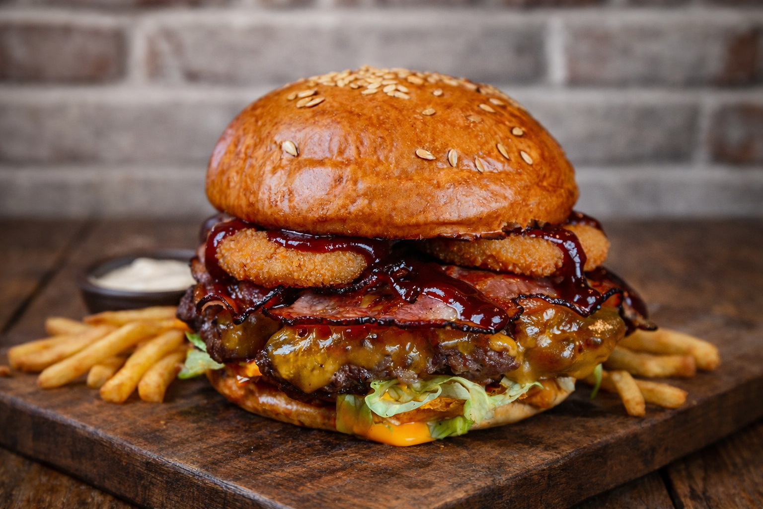 140g Vyzrálé hovězí, vypečená slanina, zlaté cibulové kroužky, pravý čedar, BBQ omáčka, dijónská omáčka, francouzská omáčka, ledový salát